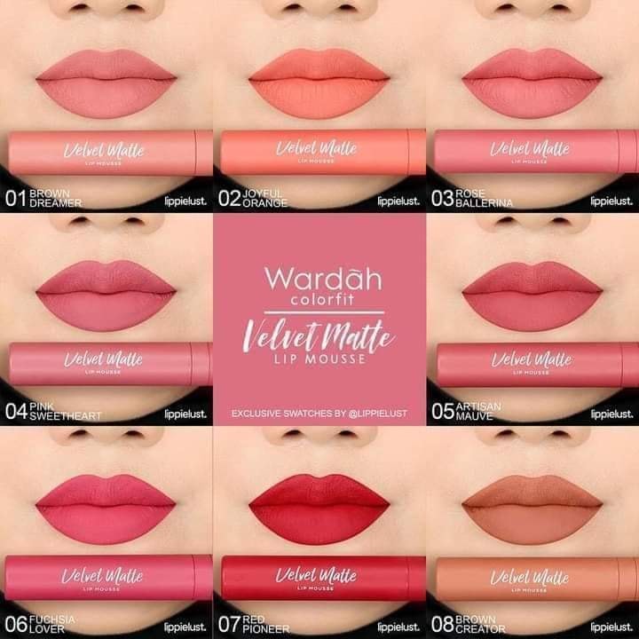 Wardah Colorfit Velvet Matte Lip Mousse adalah satu-satunya lip produk halal yang nyaman dan longlasting di bibir untuk semua aktivitas. Memiliki finishing comfort matte, yaitu hasil akhir matte namun tidak terasa lengket dan kering ataupun membuat bibir tampak pecah-pecah. Dilengkapi dengan inovasi tekstur baru velvet powdery yang terasa lembut, ringan, dan lembab di bibir.